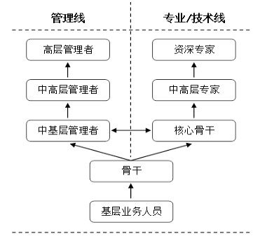 專業(yè)(技術(shù))線:指在某一個(gè)或幾個(gè)相關(guān)的領(lǐng)域內(nèi),持續(xù)深入的發(fā)展,追求專業(yè)技能的提升,以成為該領(lǐng)域內(nèi)的專業(yè)權(quán)威為目標(biāo)。